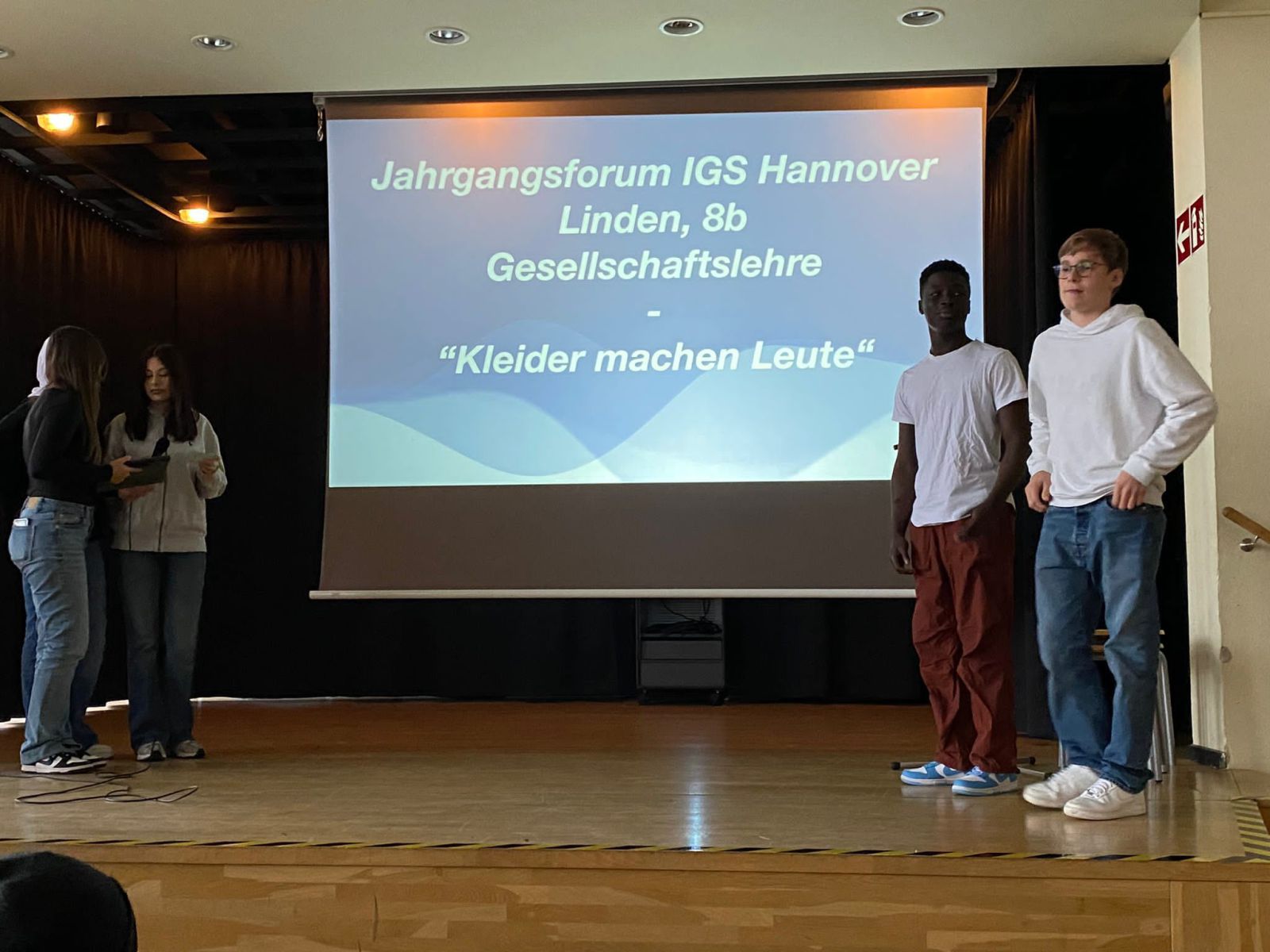 Ein ausführlicher Vortrag über die Bedeutung der Mode in der Gesellschaft gab einen Einblick in den Gesellschaftslehreunterricht der Klasse 8B. Spannend und abwechslungsreich, trugen die Jugendlichen diese nicht ganz einfache Materie vor dem versammelten Jahrgang vor.