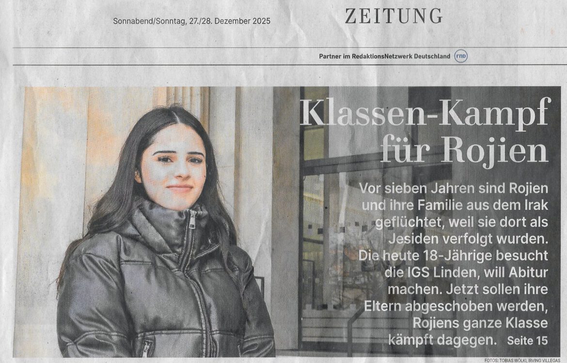 Das Engagement der 11. Klasse für ihre jesidische Mitschülerin Rojien, die u.a. eine Petition an den Landtag übergeben hatte, in der darum ersucht wurde, die Abschiebung der Eltern in den Irak zu verhindern, hat auch die HAZ beeindruckt. Sie machte am 27.12.25 den „Klassenkampf für Rojien“ nicht nur zu ihrem Aufmacher, sondern widmete diesem Kampf auch die erste Hannover-Seite (siehe HIER).